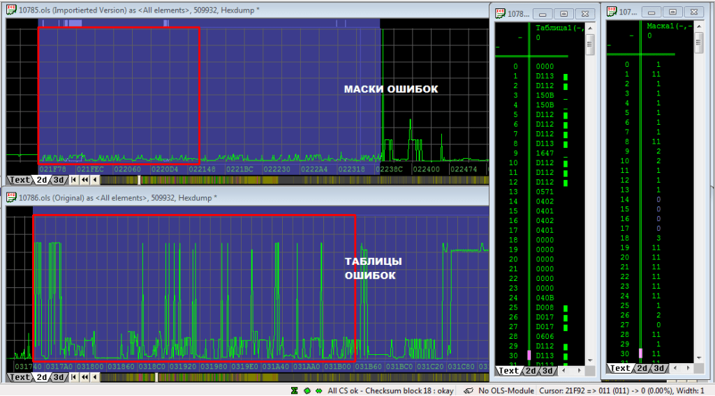 На этом участке, который выделен серым цветом мы видим так называемую маску ошибок. Эту область используют для удаления кодов ошибок, а точнее для отключения реакции на возникновение ошибок. Здесь нам мало что интересно, хотя в следующей статье я покажу ошибки которые были допущены и здесь. Причем некоторые действия калибровщика которые были сделаны, способны загнать в тупик диагностику этого авто. Но об этом в следующий раз…